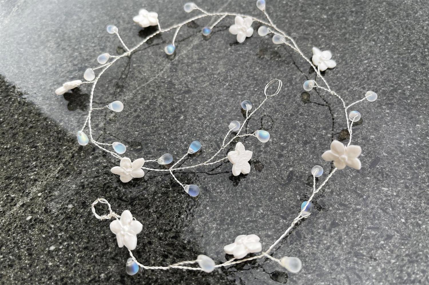 Accesoriu par mireasa flexibil cu flori albe si cristale