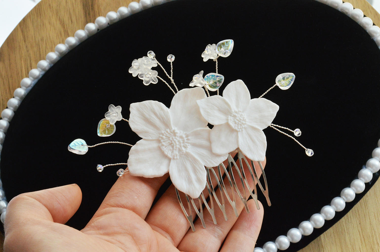 In ziua cea mai speciala din viata unei mirese, fiecare detaliu conteaza, iar pieptanul miresei cu flori albe si cristale de Cehia adauga un farmec aparte coafurii ei. Aceasta piesa deosebita este o alegere perfecta pentru a incadra cu delicatete si rafinament coafura miresei, aducand o nota subtila de eleganta.
