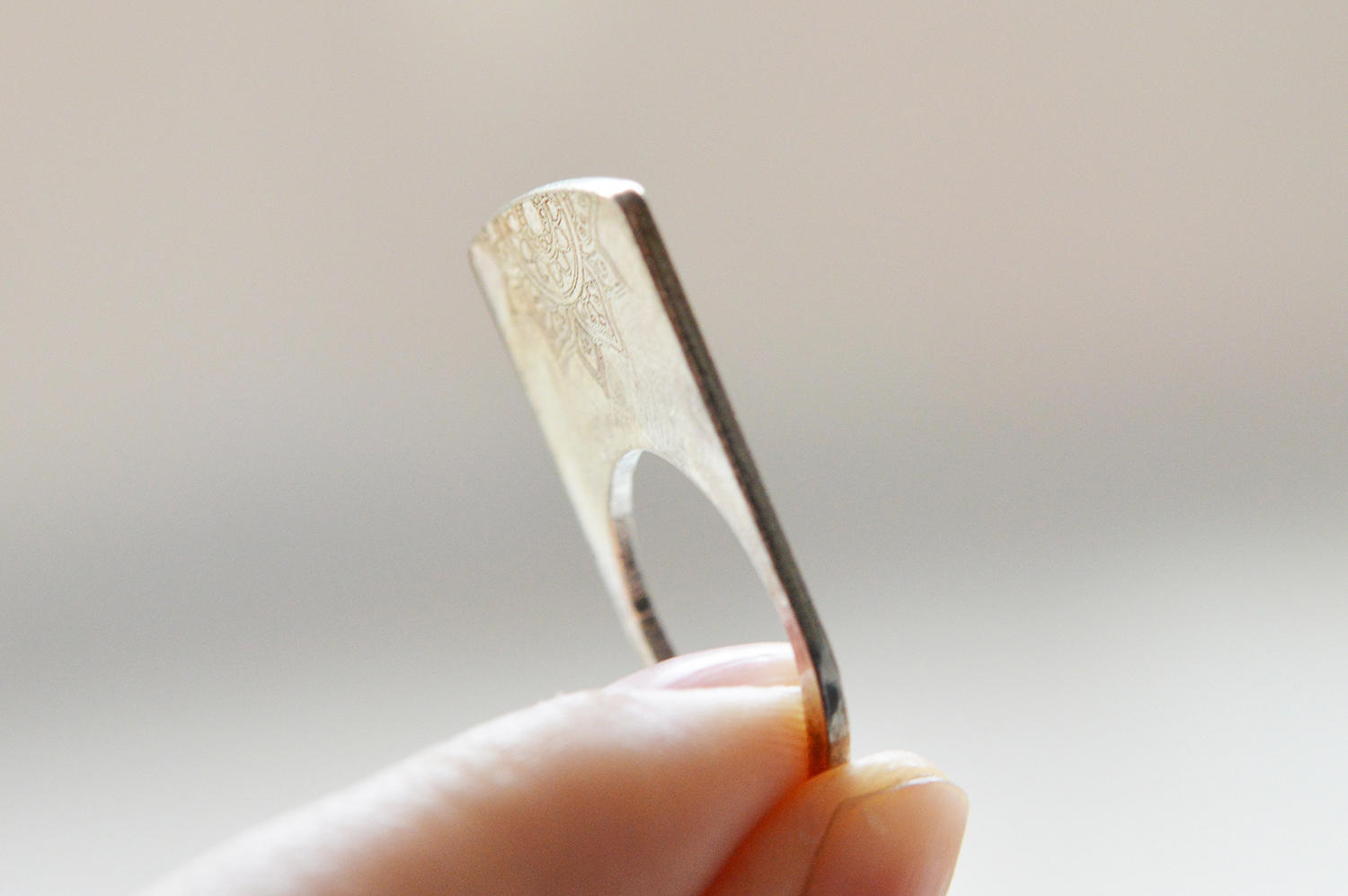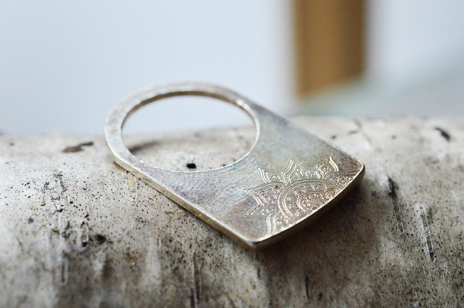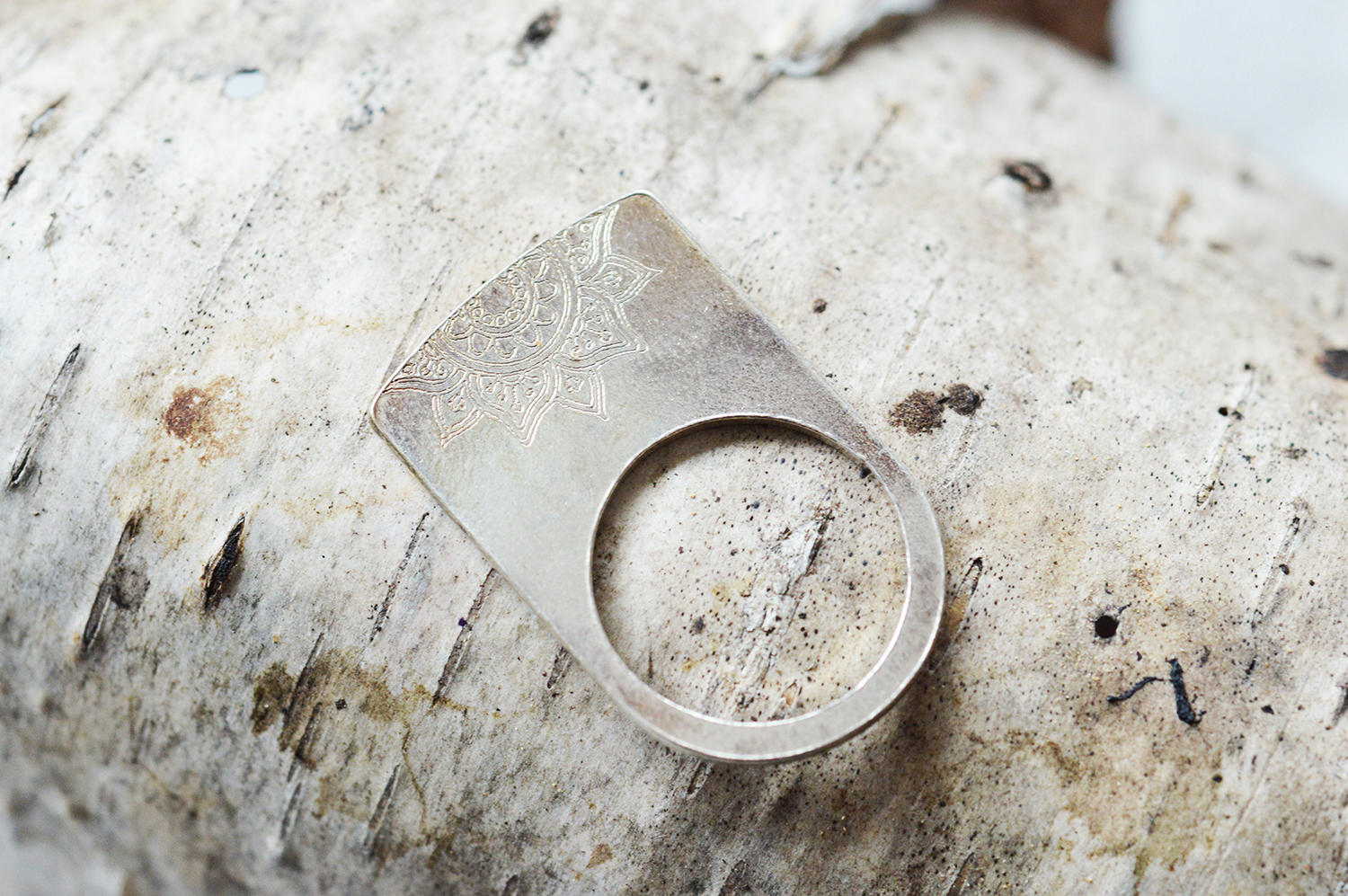 Inelul din argint Mandala are o gravura pe partea superioara a acestuia.