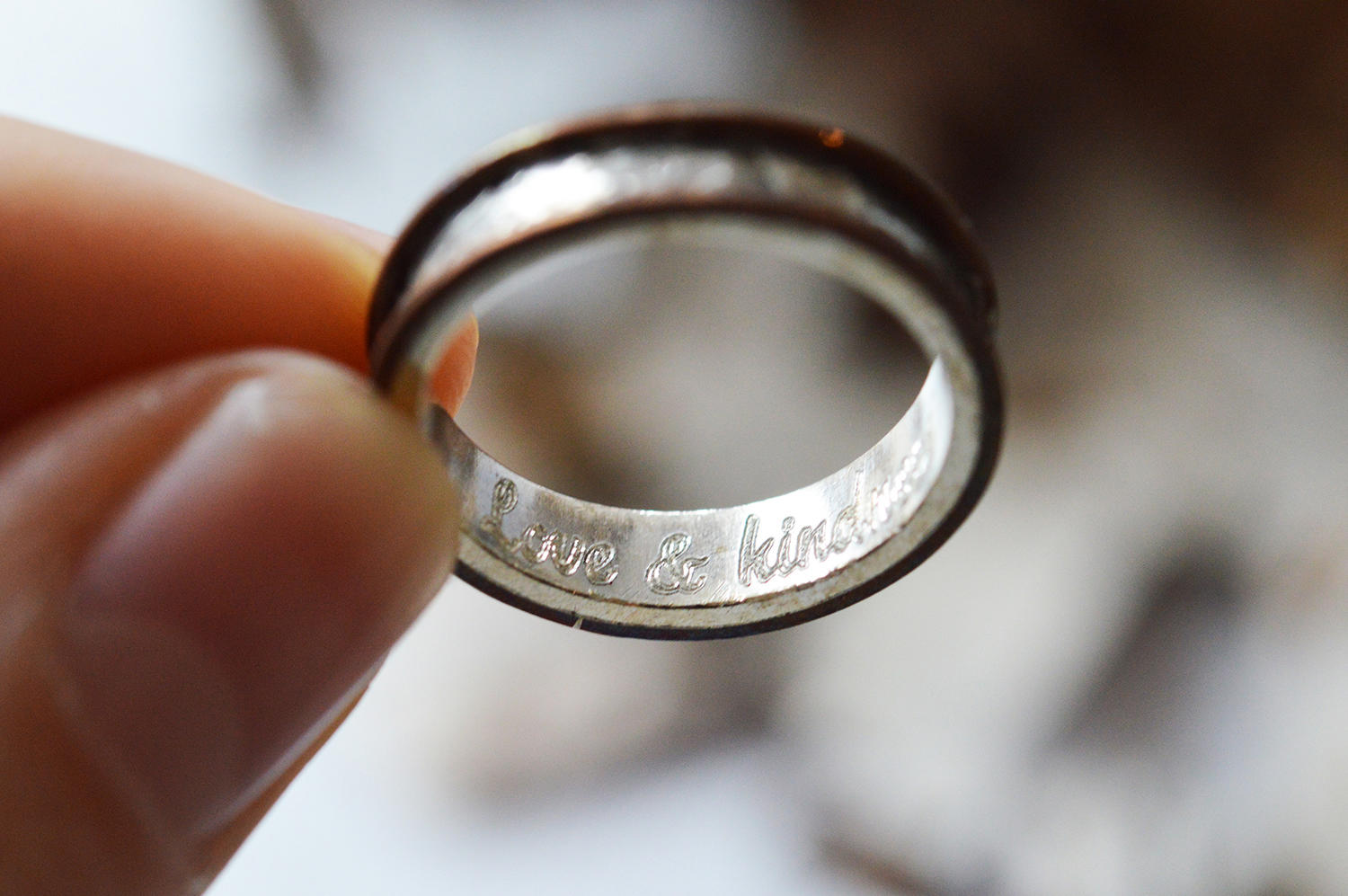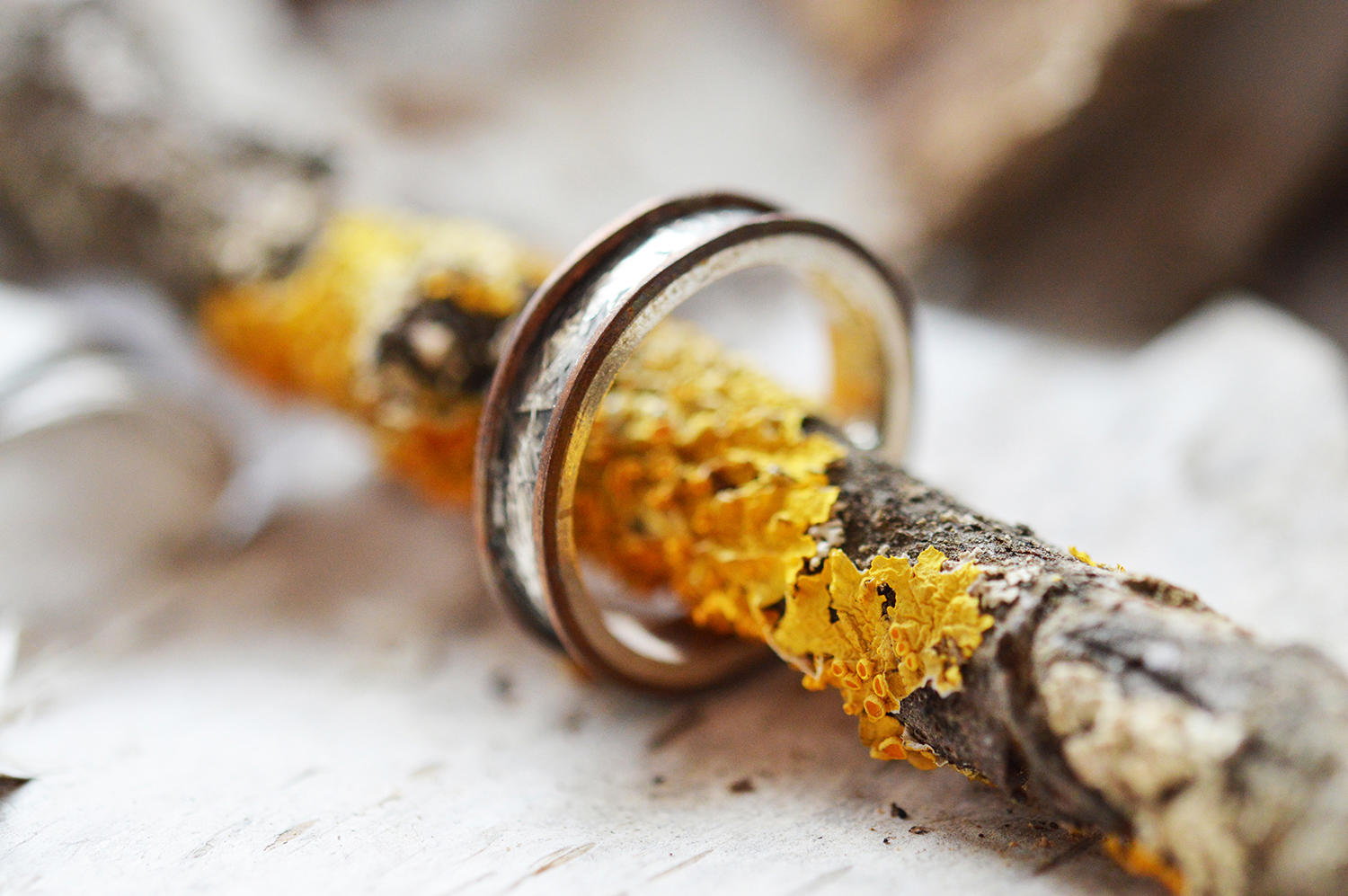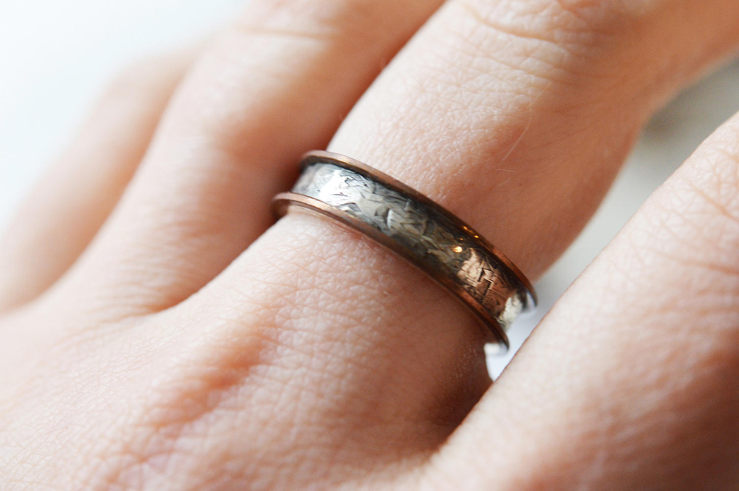 Inelul din argint si cupru este realizat prin tehnici manuale de formare a metalului.