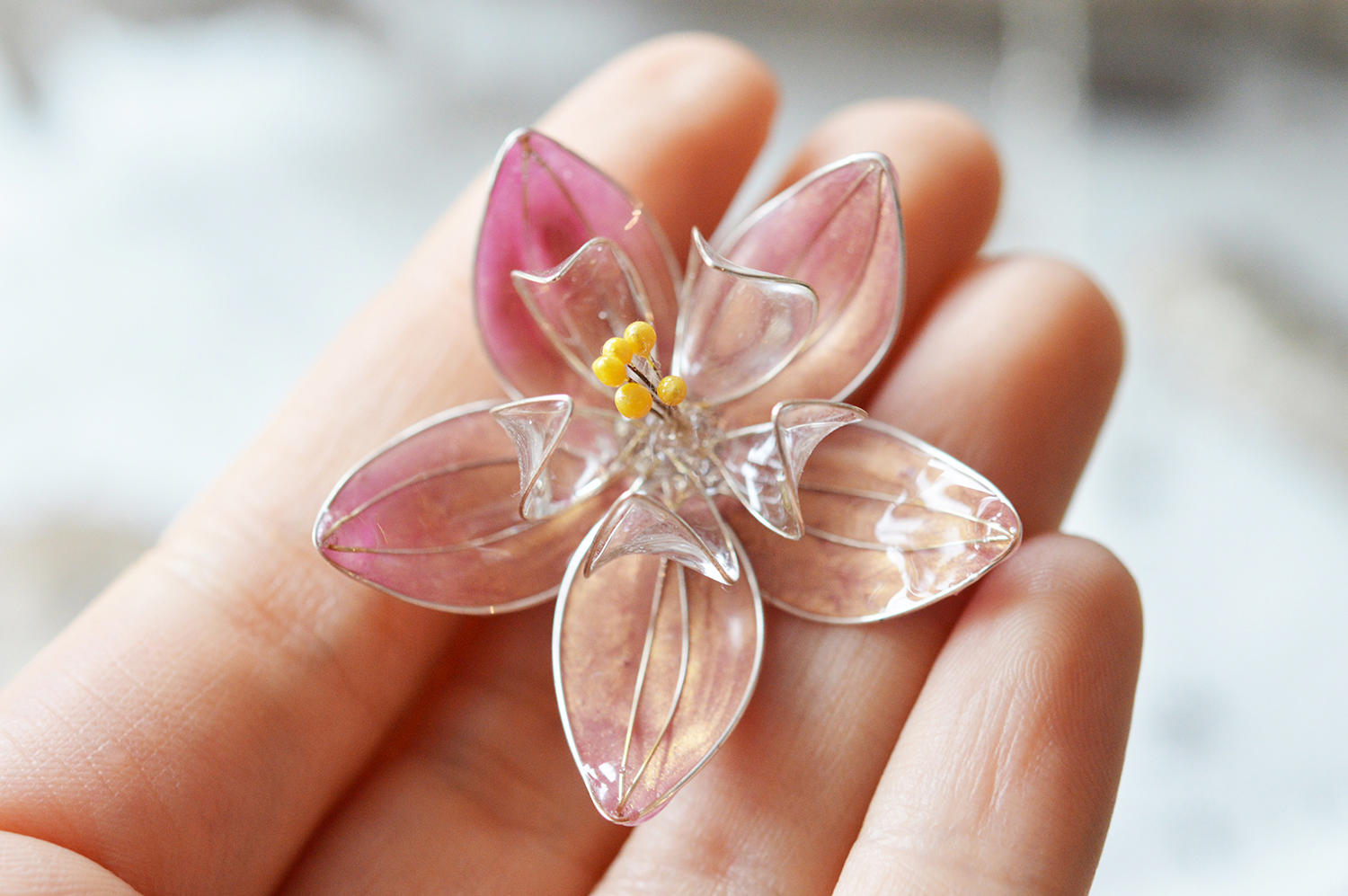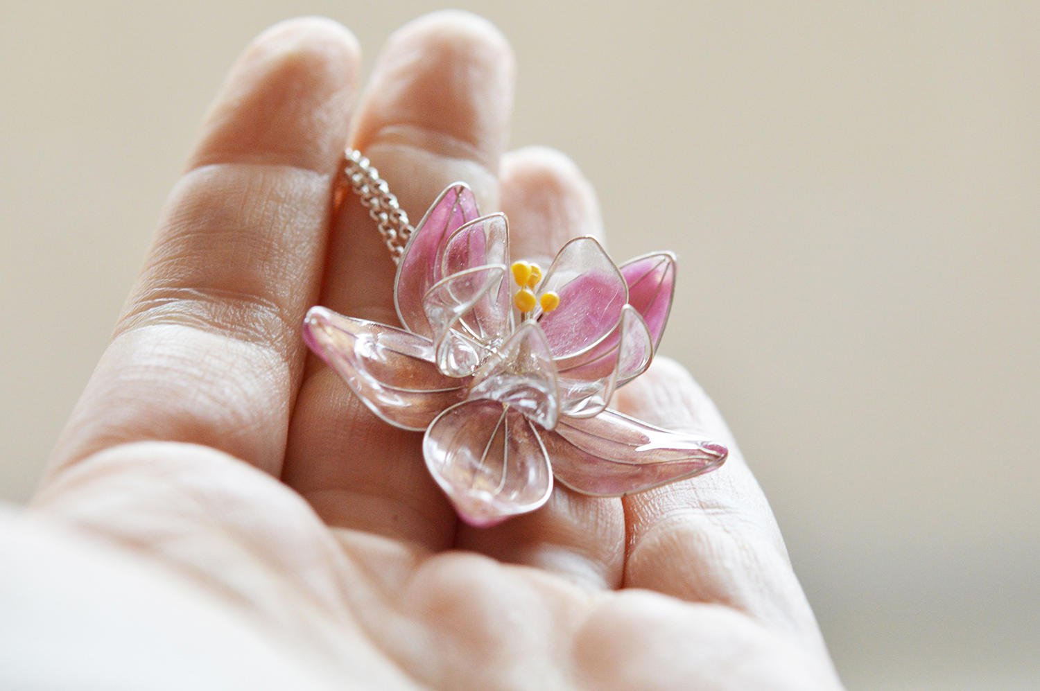Pandantivul este realizat din argint 925, inclusiv firele subtiri ale petalelor, si rasina.