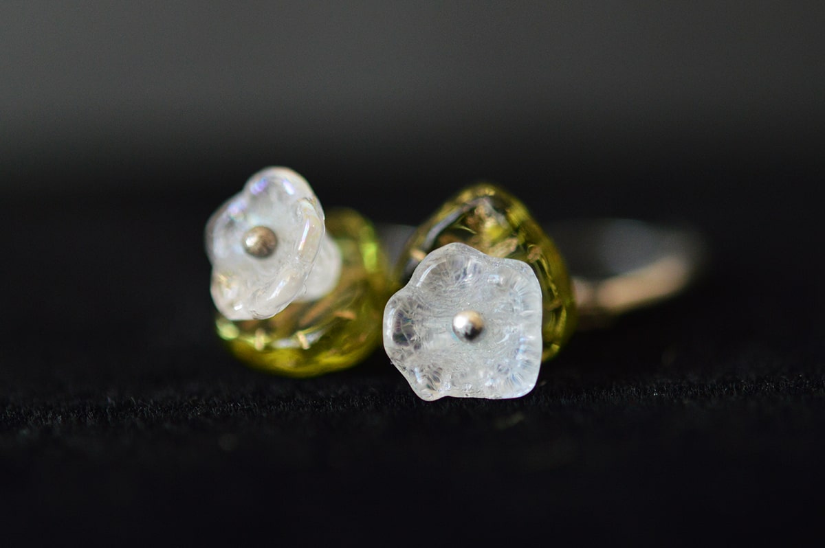 Materiale: flori acril translucide mate albe si frunze acril translucide verzi, sistem de inchidere leverback din alama.