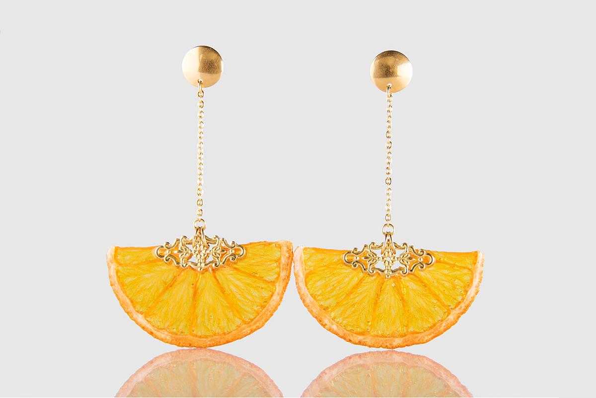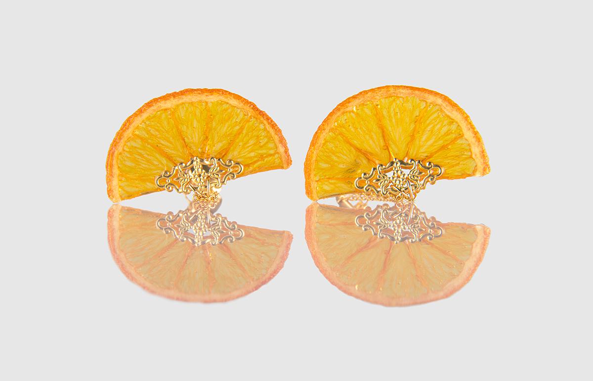Materiale: sisteme de prindere tip surub din otel inoxidabil auriu, rașină, felie de portocala naturala.