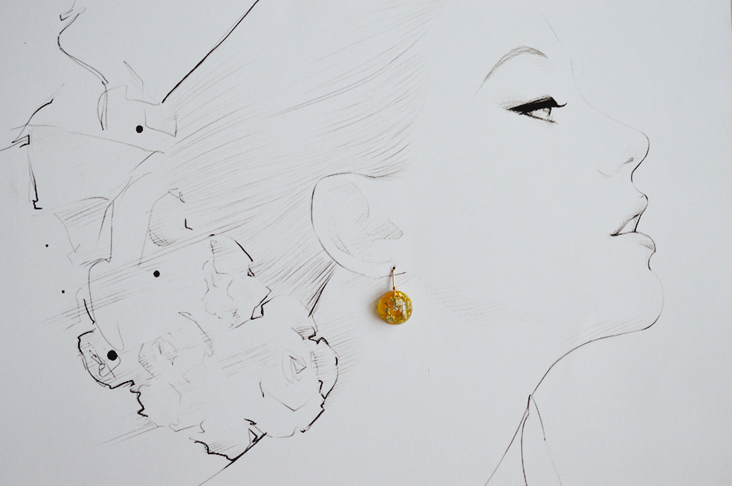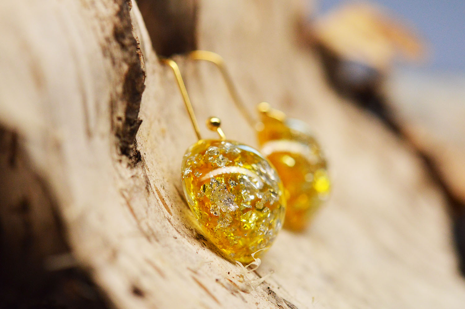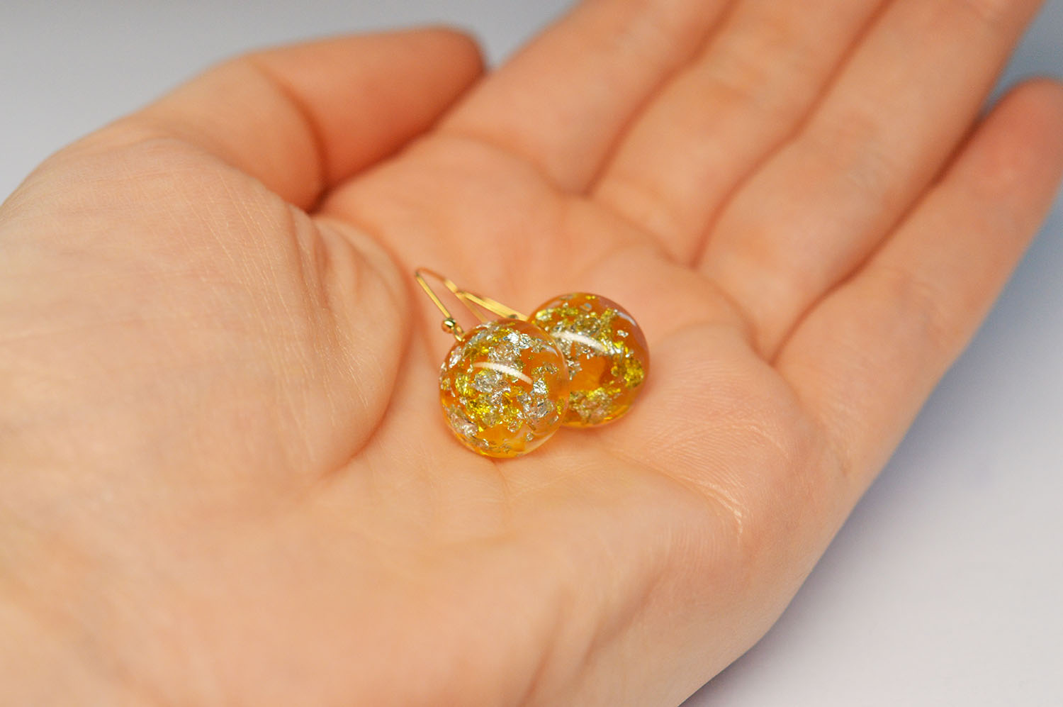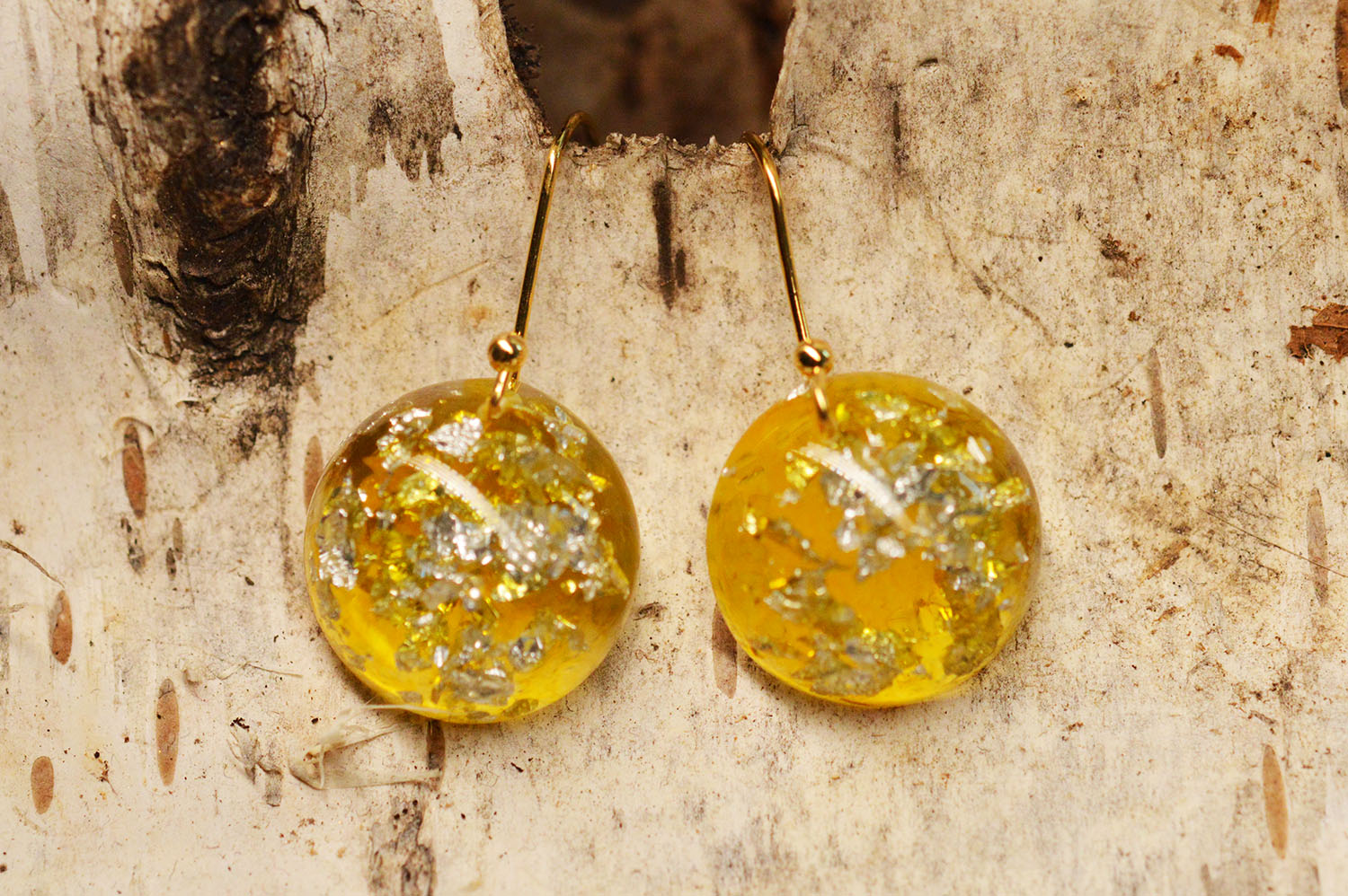 Foita de argint, rasina, pigmenti de culoarea chihlimbarului, tortite placate cu aur de 18k - toate au contribuit la realizarea acestei perechi de cercei.