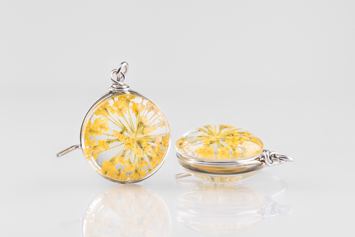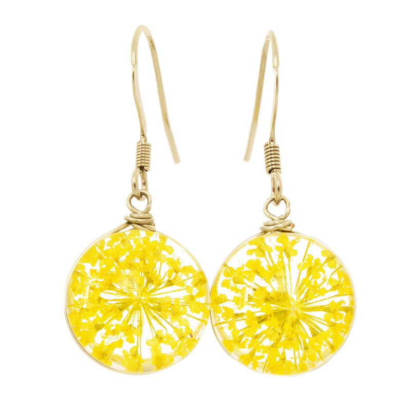 Materiale: tortite din otel inoxidabil, sticla, sarma argintata din cupru si flori naturale "Daucus carota" (in denumire populara: morcovul campului). Culoare metal: argintiu. Lungime cercei: 25 mm.