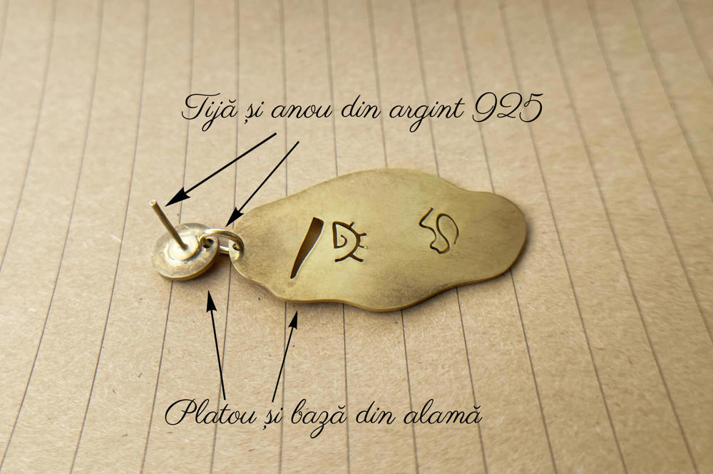 Poți alege un alt cercel din colecția "Mixed Feelings" pentru a crea o pereche unică! Materialele utilizate sunt: argint 925 pentru tijă și anou, alamă pentru platou și bază.