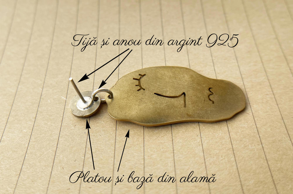 Prețul este pentru un singur cercel, nu pentru o pereche. Poți alege un alt cercel din colecția "Mixed Feelings" pentru a crea o pereche unică! Materialele metalice folosite sunt: argint 925 pentru tijă și anou, alamă pentru platou și bază.