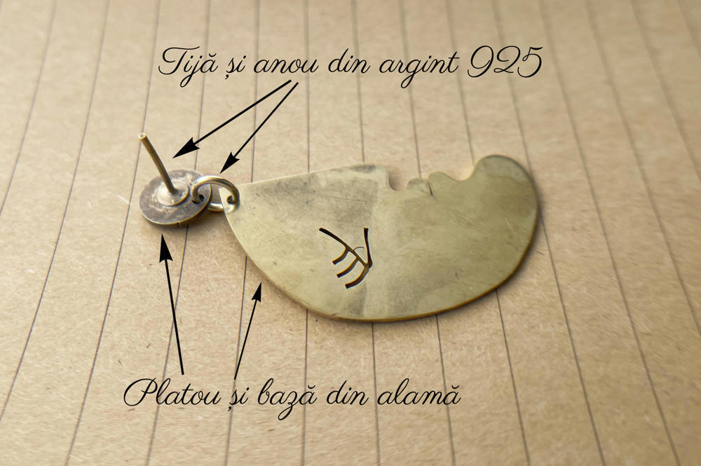 Poți alege un alt cercel din colecția "Mixed Feelings" pentru a crea o pereche unică! Materialele metalice folosite sunt: argint 925 pentru tijă și anou, alamă pentru platou și bază.