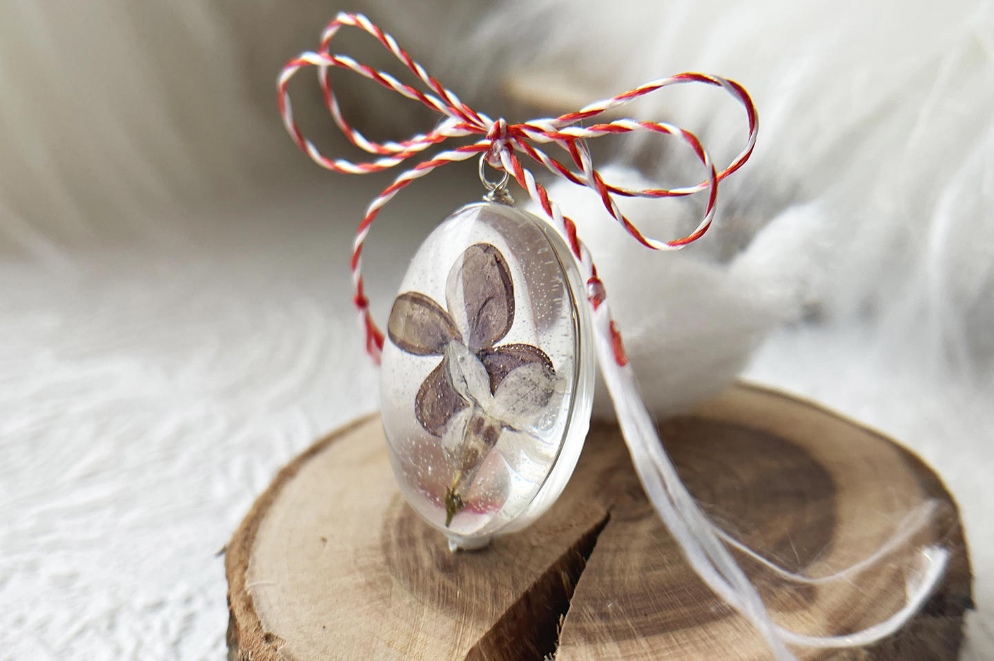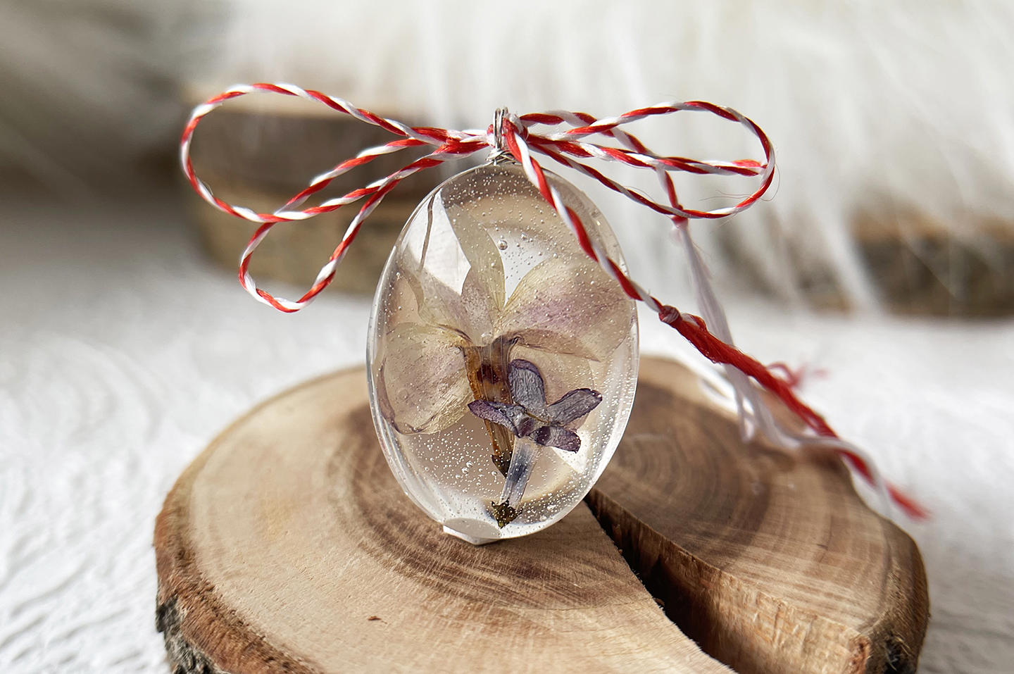 Este realizat manual cu floare naturala, liliac, sticla, rasina si argint 925.
