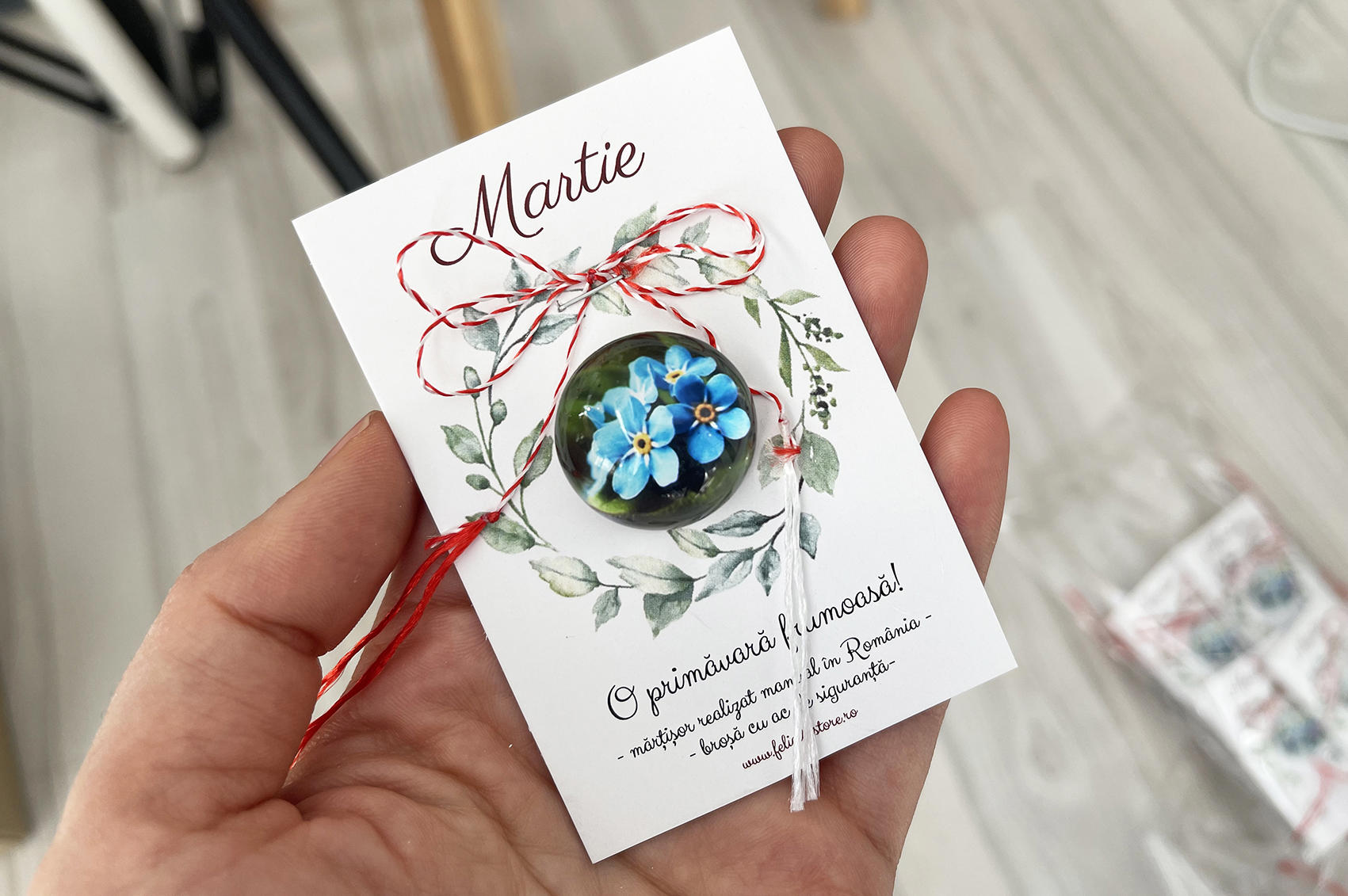 Brosa are o dimensiune de 25mm si vine atasat pe cartonas, exact ca cel din imagine, la care se adauga plicul cu inchidere origami. Fotografia principala a martisorului este cu titlu de prezentare.