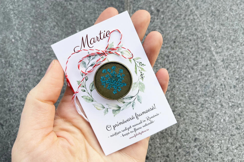 Brosa are o dimensiune de 25mm si vine atasat pe cartonas, exact ca cel din imagine, la care se adauga plicul cu inchidere origami. Fotografia principala a martisorului este cu titlu de prezentare.