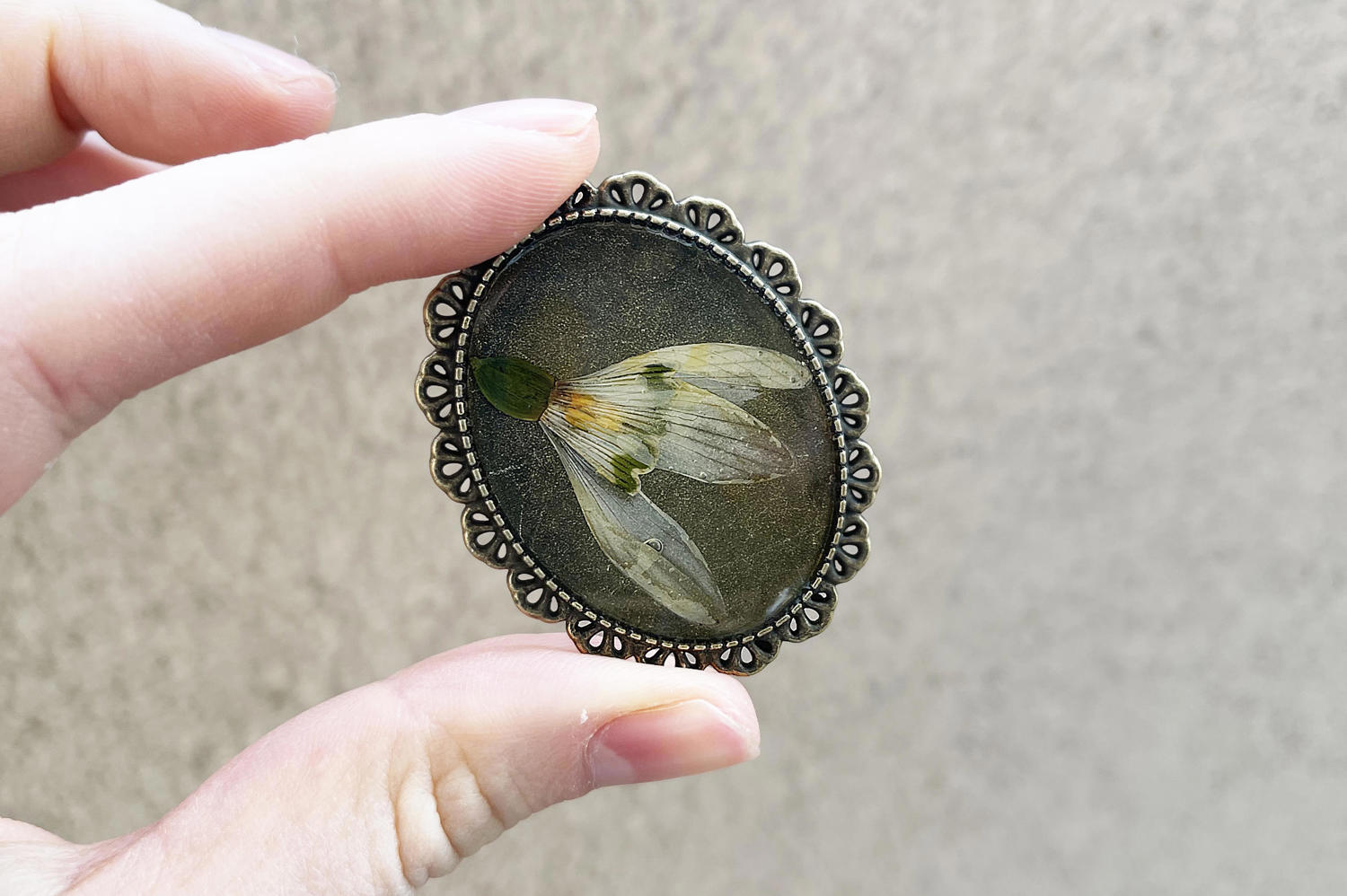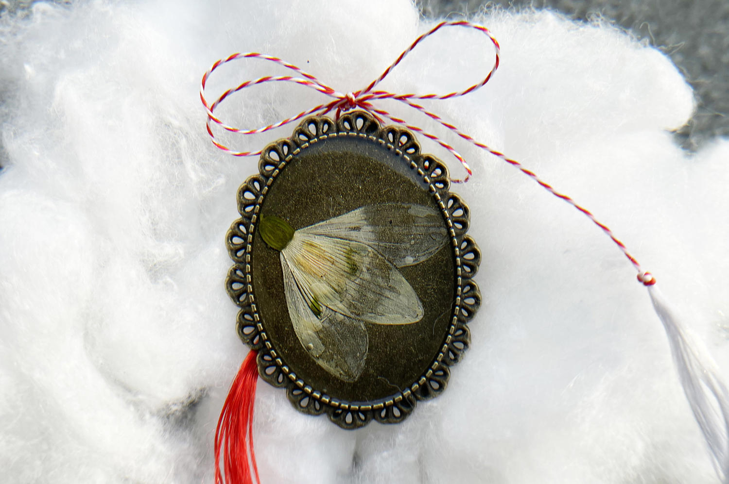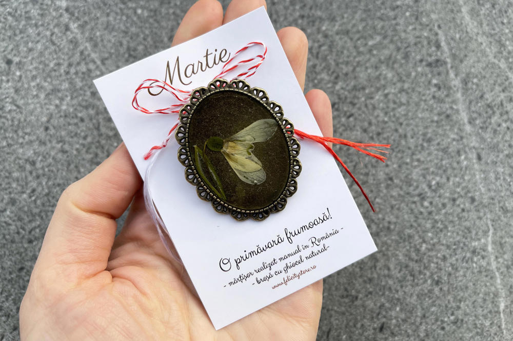 Brosa are o dimensiune de 48mm si vine atasat pe cartonas, exact ca cel din imagine, la care se adauga plicul cu inchidere origami. Fotografia principala a martisorului este cu titlu de prezentare.