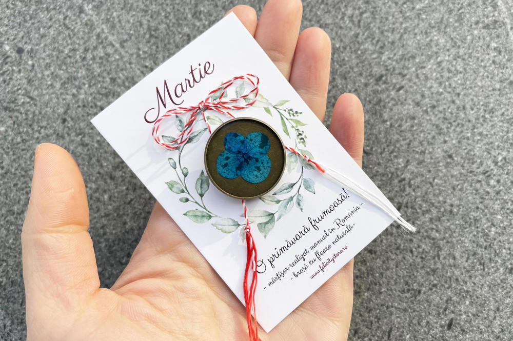 Nuantele pot sa difere de la o brosa la alta, unele fiind mai deschise la nuante, altele, mai inchise. Va rugam sa vizualizati toate pozele produslui. Brosa vine atasata pe cartonas, exact ca cel din imagine, la care se adauga plicul cu inchidere origami. Fotografia principala a martisorului este cu titlu de prezentare.