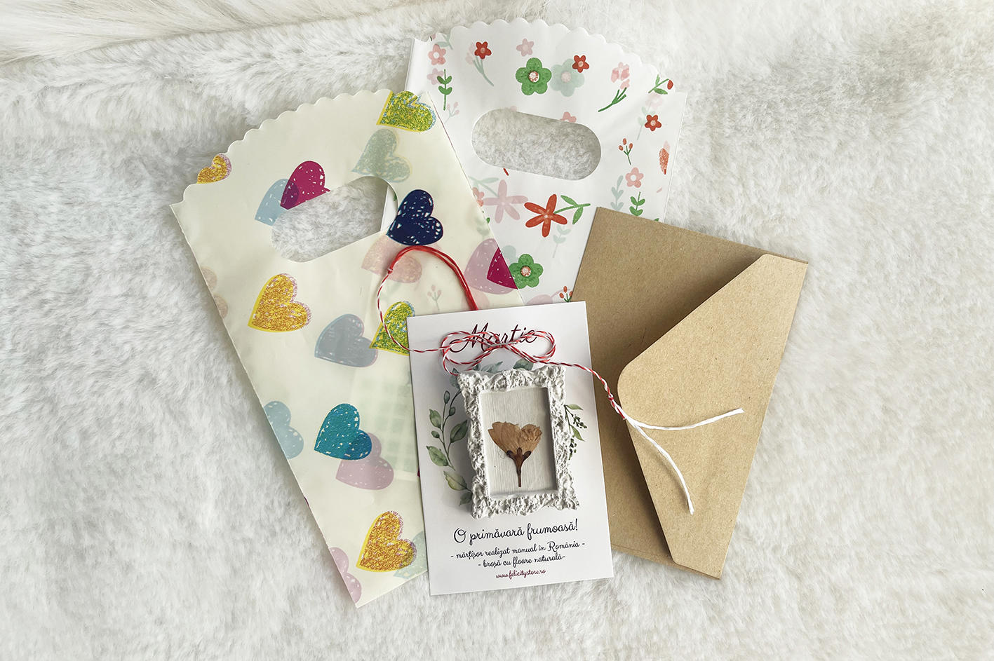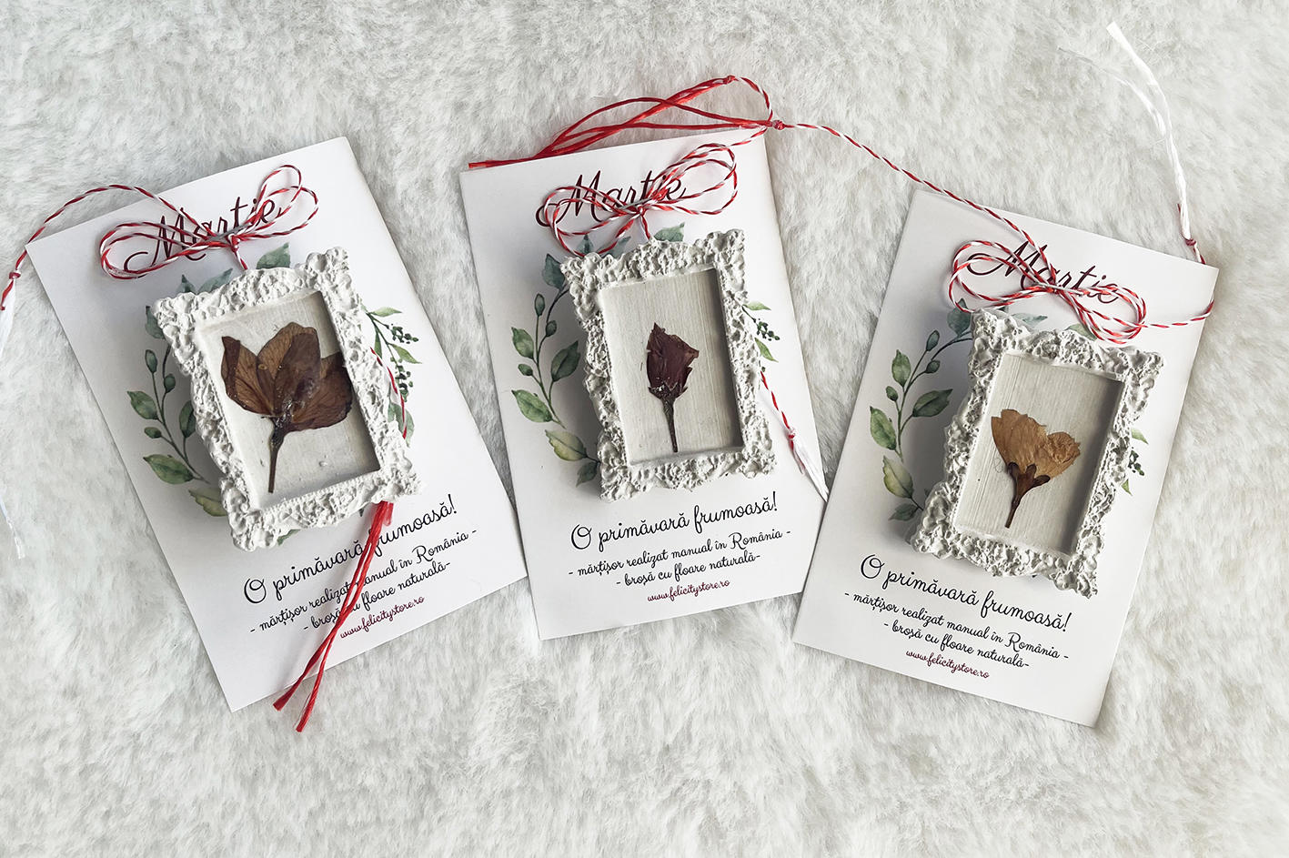Brosa are o dimensiune de 4,7 x 3.5 cm si vine atasat pe cartonas, exact ca cel din imagine, la care se adauga o punguță sau un plic, asemeni celor din imagine. Fotografia principala a martisorului este cu titlu de prezentare.