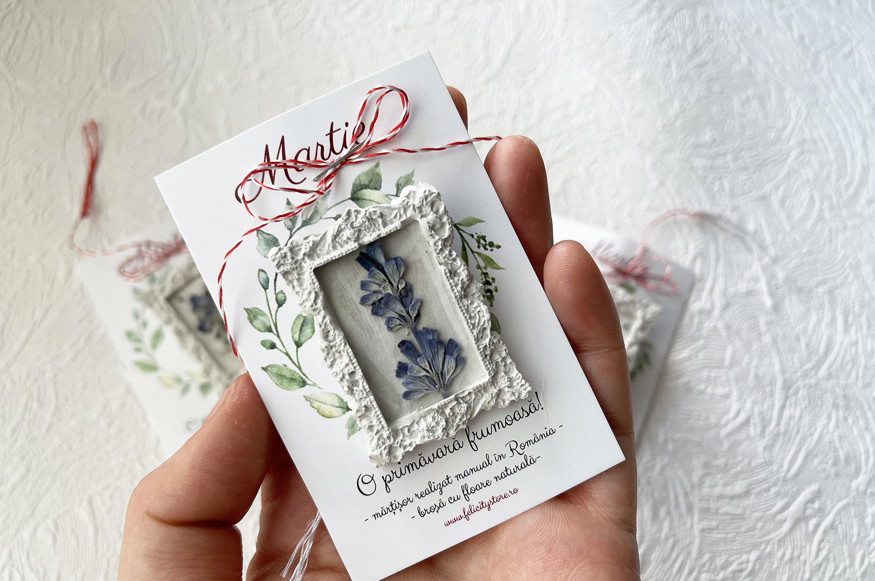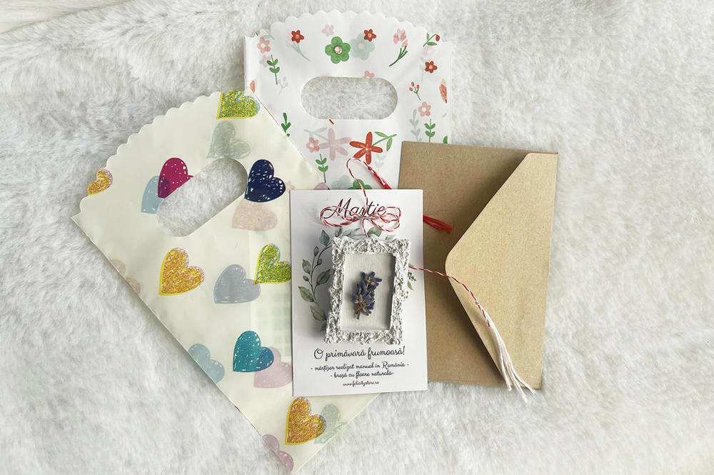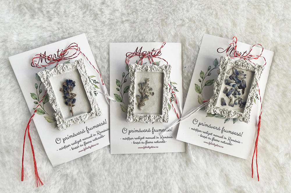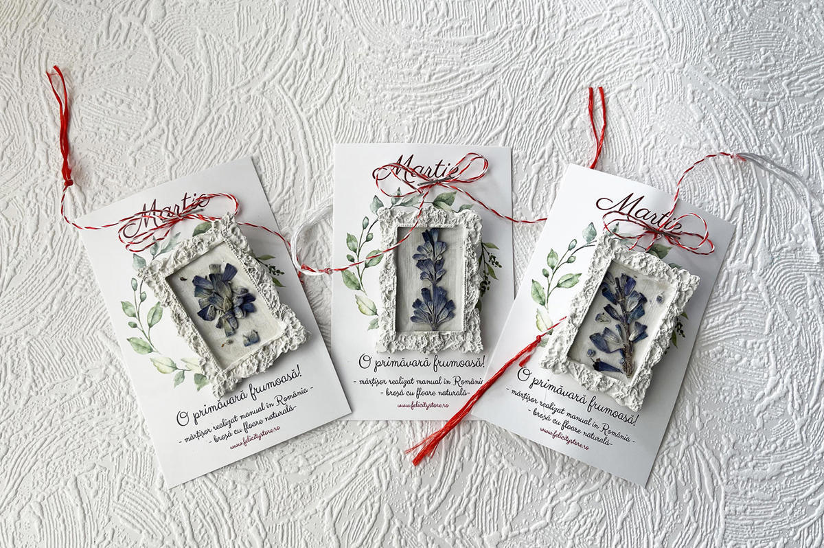 Brosa are o dimensiune de 4,7 x 3.5 cm si vine atasată pe cartonas, la care se adaugă o punguță sau un plic, asemeni celor din imagine. Fotografia principală a mărțișorului este cu titlu de prezentare.