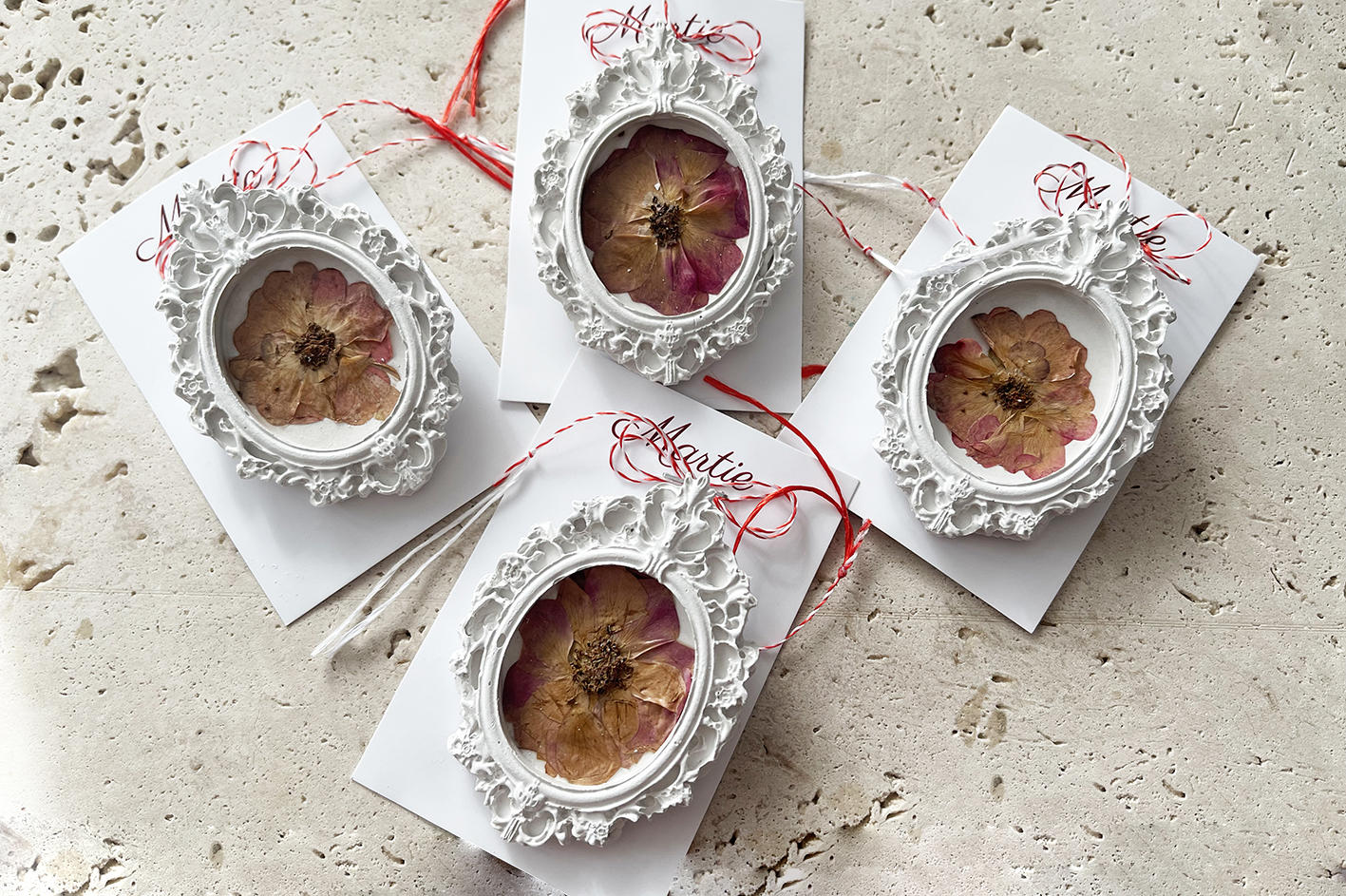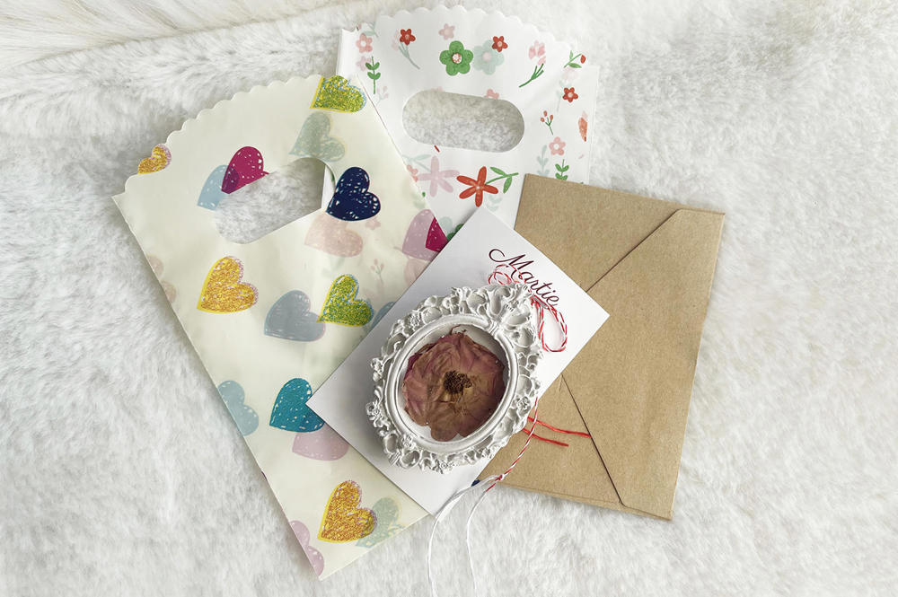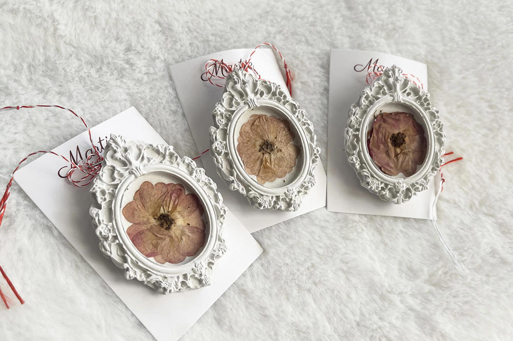 Brosa are o dimensiune de 7,5 x 5,2 cm si vine atasată pe cartonas, la care se adaugă o punguță sau un plic, asemeni celor din imagine. Fotografia principală a mărțișorului este cu titlu de prezentare.