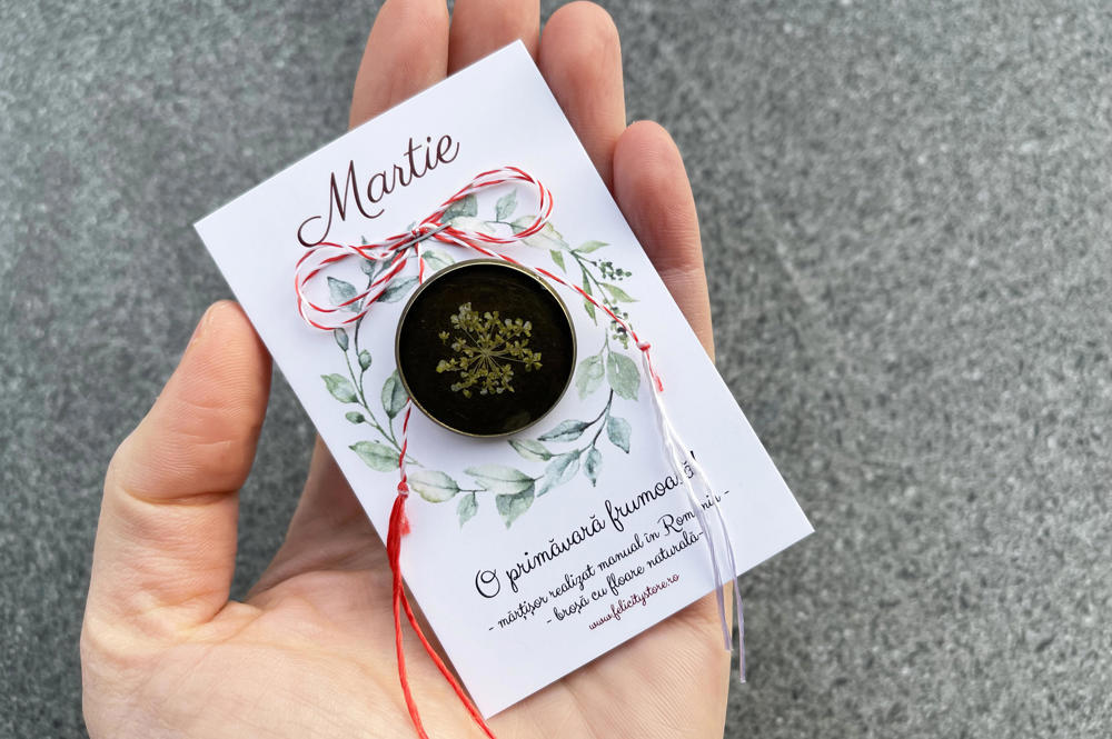 Brosa are o dimensiune de 25mm si vine atasat pe cartonas, exact ca cel din imagine, la care se adauga plicul cu inchidere origami. Fotografia principala a martisorului este cu titlu de prezentare. ATENȚIE!