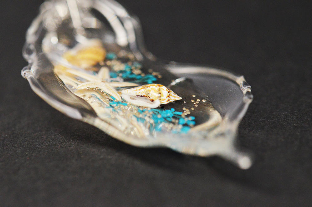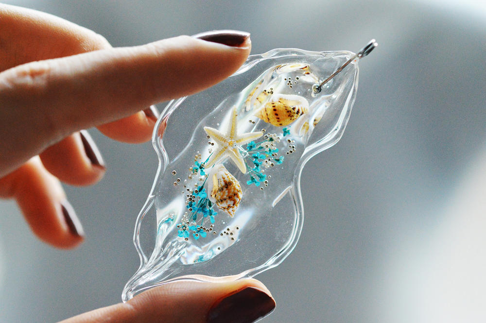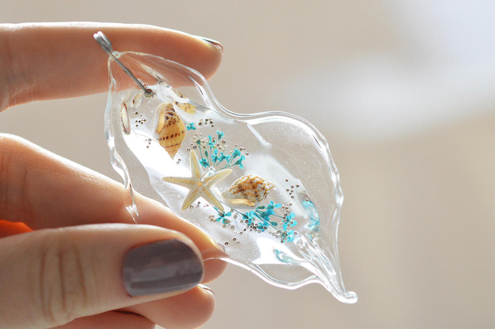 Realizat cu multa finete in atelierul nostru, pandantivul contine sticla, rasina, flori naturale Daucus Carota de culoare albastru - azur, scoici si stea naturala de mare. Sticla este transparenta.
